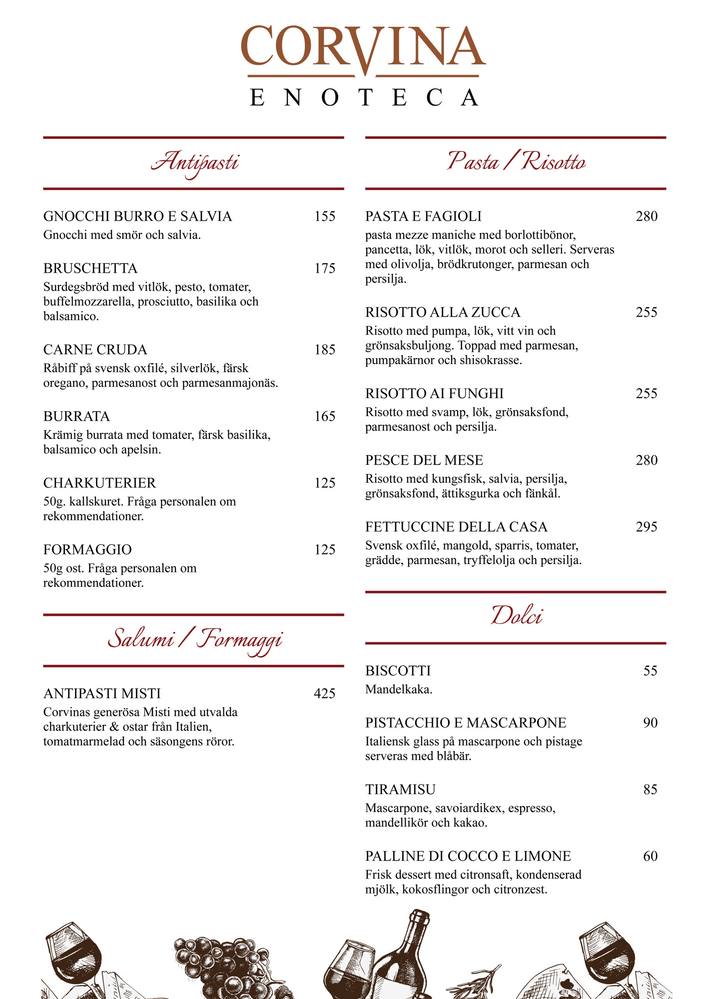 Hos oss kan ni avnjuta en helkväll med fantastiska italienska rätter eller bara beställa en chark eller ostbricka och avnjuta detta tillsammans med utvalda viner från hela Italien!